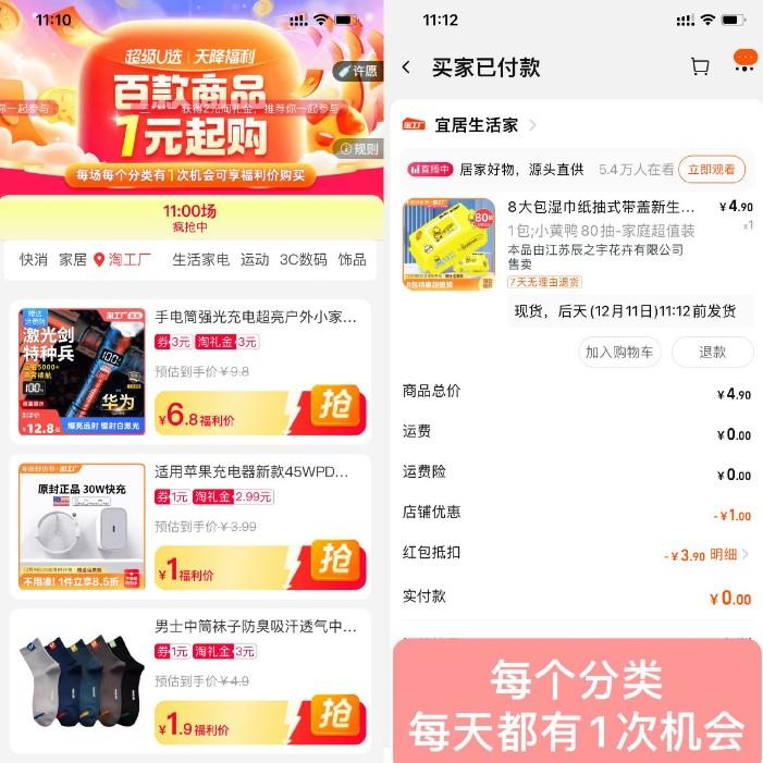 淘宝天降福利1元撸实物包邮