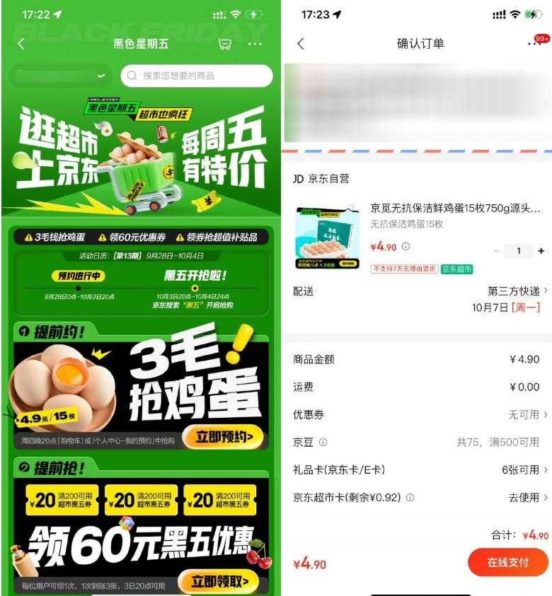 京东超市黑五4.9亓抢15枚鸡蛋