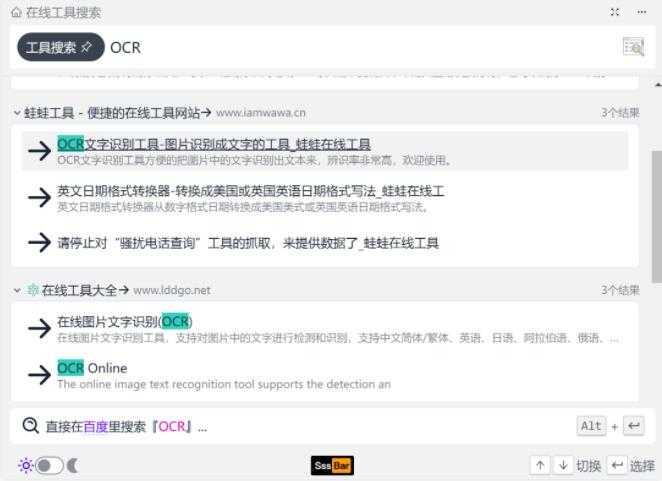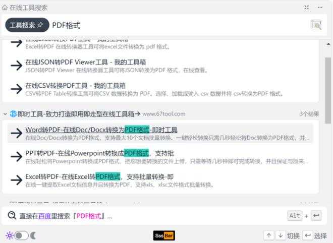 PDF 格式转换等等,只要你给 sssbar 一个关键词,它都能帮你快速找到对应的在线工具。