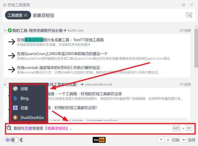 当然,如果你对 sssbar 提供的搜索结果不满意,也能跳到其他搜索引擎另行搜索。
