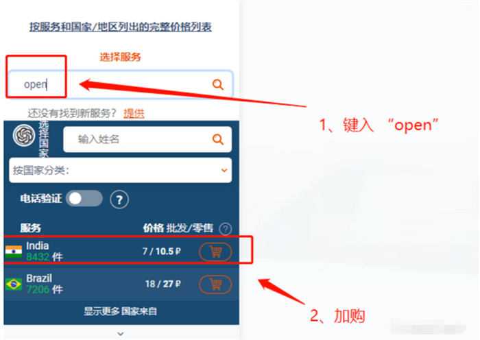 充值好了以后回到首页搜索「open」关键字就可以找到 OpenAI 验证码的临时号码购买链接,点击「购物车」。