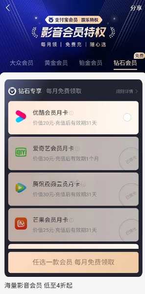 支付宝钻石会员每月免费领腾讯/优酷等会员