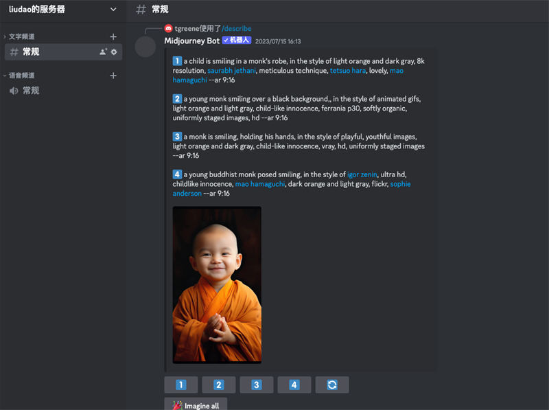 首先,我们找到一张图片,然后发到midjourney,他会生成4条描述关键词。