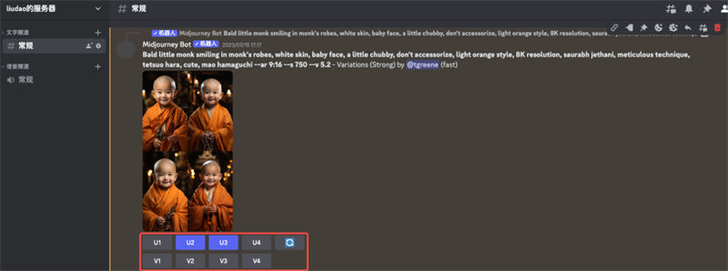 第三,用英文发送指令后,会给你生成4张图片,点击U1-U4,会给你生成高清版本图片;点击V1-V4,又会给你再生成4张图片。