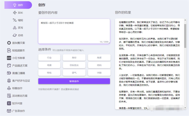 第一种,一键快速实现,使用我推荐的AI文案工具,再里面输入:让它帮你生成心灵鸡汤、禅语等相关语录。