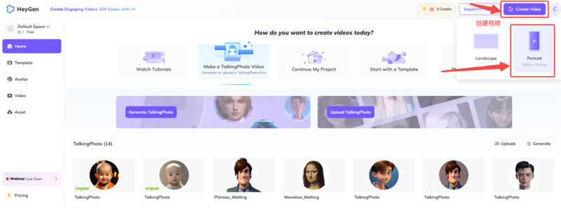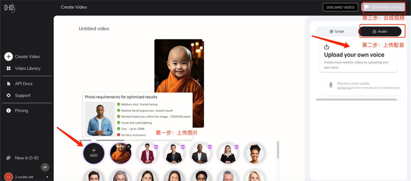 另外一种,d-id,studio.d-id.com,不仅可以合成视频,还可以直接生成你想要的人物形象,更省事,以及不同的视频尺寸。效果稍微差一些,一个账号送20积分,但是可以做6-8个视频,一个账号用完了,就再注册一个账号,基本上可以实现免费使用了。
