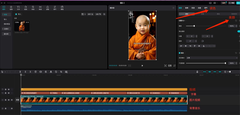 将第四步生成的视频导入到剪映里,识别字幕、添加背景音乐、调色、混合等等方式制作原创视频。比如通过第三款工具,给小和尚背景添加寺庙、山水、下雨等背景特效,这样让视频变得更丰富些。