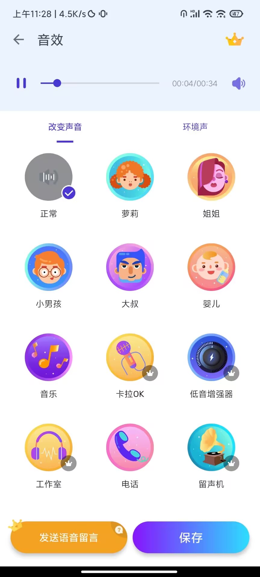 Voice Changer Pro v1.02.71「特效变音魔术师」简称:变声器专业版,变音魔术师是一款改变语音并存储的录音变声应用,利用它您可以和家人会欣赏您改变的声音,开心笑一笑,或者和您的朋友分享,开个玩笑,甚至您可以利用您的声音弹钢琴创作乐曲,而且您可以直接从任何应用发送变化后的声音!快来录下您的声音,让app来变魔术吧!