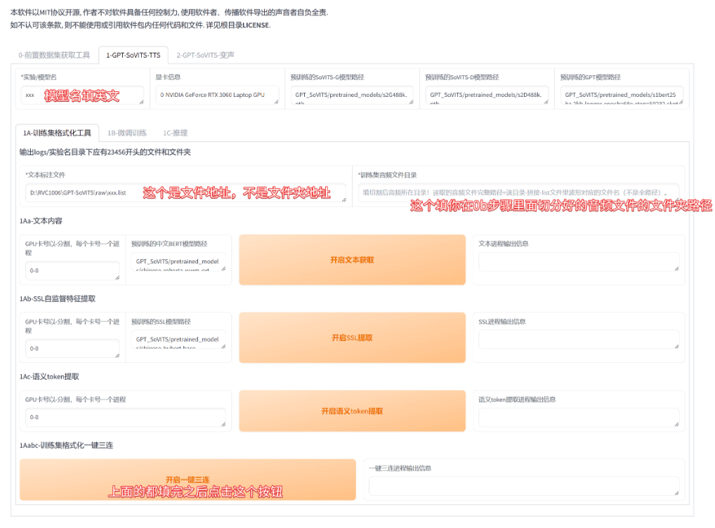 1A. 点击最开始弹出的界面上面的"1-GPT-SoVITS-TTS"进入这个步骤,首先填写模型名,一定不能填中文,填英文就好,然后填好“文本标注文件”的路径,一般为GPT-SoVITS-beta\output\asr_opt\xxx.list文件,之后填“训练集音频文件目录”,一般为GPT-SoVITS-beta\output\slicer_opt,都填完之后点击最下面的“一键三连”按钮,等待一小会,这时可以在控制台看到进度,显示完成之后进入下一个步骤