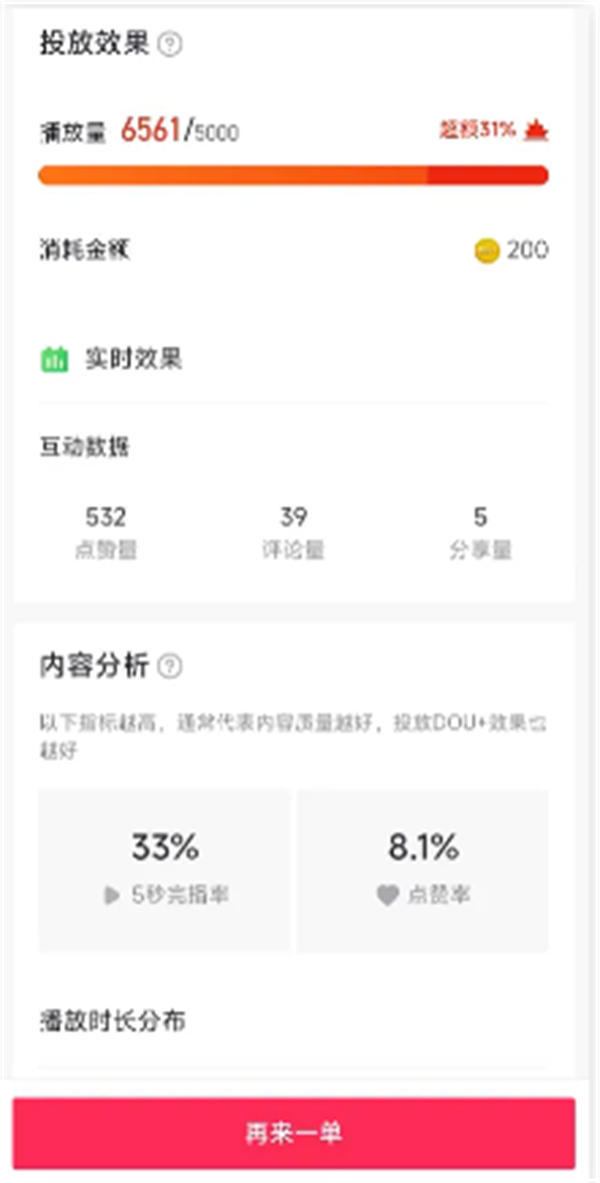 再者,前文中反复给大家强调了,Dou+的流量是通过付费的方式向系统采买的“测试”流量!这个流量所反馈的数据模型(完播、点赞、评论、转发),如果较为优秀,会对你作品的自然流量有所撬动。因此,想要获得一定的数据反馈,归根究底还是作品质量的问题!