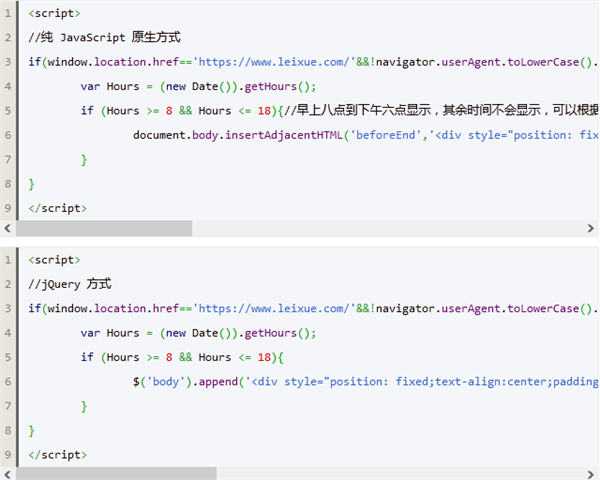 那么就来看看这次我用的 JavaScript 来实现备案不关站的一个升级方法,其中可以根据域名来判断只在首页生效,以及不对搜索蜘蛛抓取做渲染,同时还可以自定义显示的时间周期,大家可以根据代码修改。为了完整性,我截取了图片给大家展示。