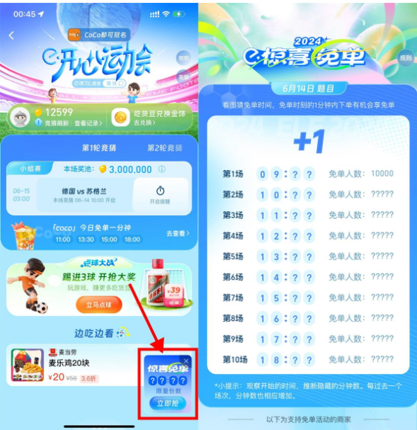 饿了么搜索“免单”->右下角“惊喜免单”->每1小时1场,每场最多免39亓,每人最多可免1次